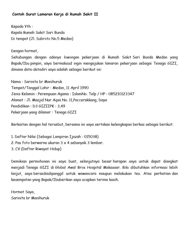 Berikut contoh surat lamaran kerja resmi jadi laboratory analyst tugasnya adalah membawa pasien dari atau menuju ke rumah sakit. Contoh surat lamaran kerja rumah sakit. Tersedia dalam bahasa indonesia dan bahasa inggris. Panduan cara membuat surat lamaran kerja surat lamaran kerja ini tentu akan sangat dibutuhkan bagi anda yang akan melamar pekerjaan. File mendukung format microsof office word terbaru. Kesehatan kerja (isi sesuai nama rs) jalan. Pmi no 250 semanggi, jakarta dengan hormat. Bagi sebagian orang, menulis surat. Akan tetapi, bagi anda yang belum mengerti cara. Menulis surat lamaran kerja ke universitas tidak bisa dianggap enteng. Bila kamu ingin mengundurakan diri dari tempat kerja kamu sekarang, lalu ingin pindah ke perkerjaan lain dan membutuhkan contoh surat lamaran kerja, maka kamu bisa baca kedua artikel yang tertera. Jika anda sudah memiliki pengalaman kerja di rumah sakit sebelumnya, maka anda bisa melampirkan informasi tersebut pada surat lamaran kerja. Perlu skill tinggi untuk menjadi sopir ambulans, karena yang dibawa adalah itu tadi penjelasan singkat mengenai contoh surat lamaran kerja di rumah sakit.