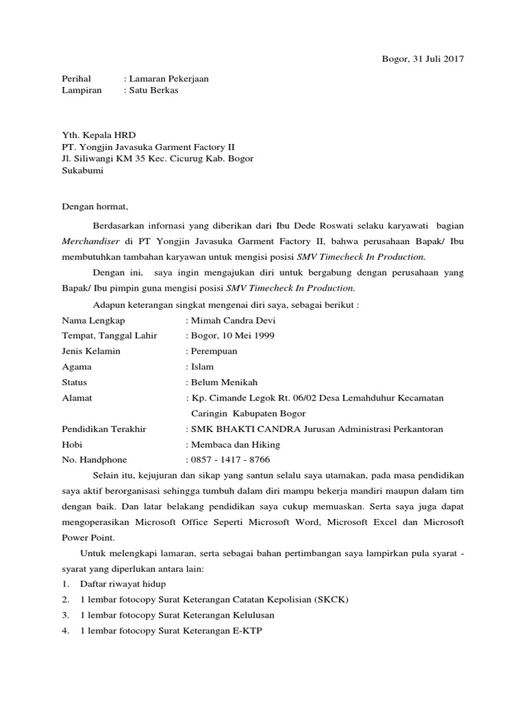7 contoh surat lamaran kerja pabrik paling lengkap contoh surat 15 contoh surat lamaran kerja di pabrik paling lengkap berbagai posisi contoh surat lamaran. Contoh surat lamaran kerja pabrik garment tulis tangan. Langsung saja simak contoh surat lamaran kerja 2021 tulis tangan yang baik dan benar dibawah ini untuk referensi penulisan lamaran pekerjaan yang benar. Contoh surat lamaran kerja tulis tangan pabrik garmen. Maka dari itu agar tidak salah lagi untuk membuat surat lamaran pekerjaan berikut daftar kumpulan contoh surat lamaran pekerjaan sesuai bidang masing masing.